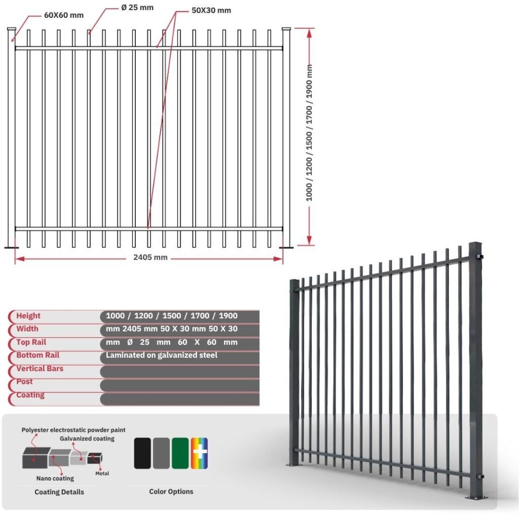 The Bamboo Fence Standard offers the perfect combination of security, durability, and modern design. With a width of 2405 mm and various height options, it is highly versatile ideal for private properties, as well as commercial and industrial applications. By combining high security with elegant aesthetics, it stands out as the optimal choice for environments that demand both protection and sophisticated design.